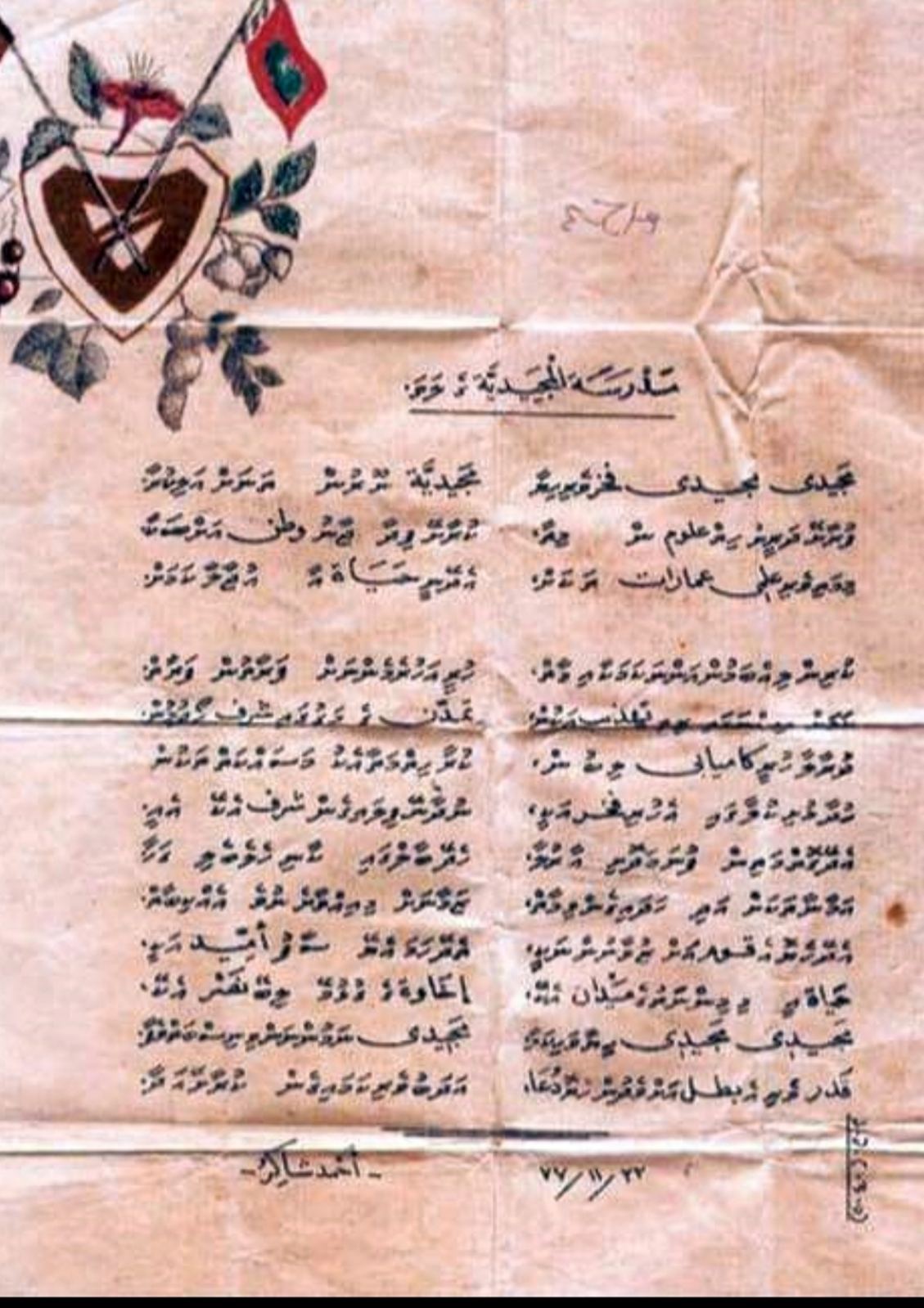 މަތީގައި އެވަނީ މަޖީދިއްޔާ ސްކޫލްގެ ލަވަ، އެންމެ ފުރަތަމަ ލިޔުއްވި ޝާޢިރު، ތަޅަމުދިގޭ އަޙްމަދު ޝާކިރު (ޝާޢިރުލްމަޖްހޫލު) އެލިޔުއްވި ގޮތަށެވެ. އެއީ މިހާރު އަޅުގަޑުމެން މިކިޔާ ލަވަޔާ ތަފާތުކޮށް އޮތް ލަވަޔެކެވެ. މިލަވަ އެންމެ ފުރަތަމަ ކިޔާފައިވަނީ 1953 ވަނަ އަހަރު، އައްނަބީލް އިބްރާހީމް ފަރީދު ދީދީ ގެ ނާޡިރު ކަމުގައި ބޭއްވުނު އަހަރީ އިނާމުދިނުމުގެ ޖަލްސާގައި ކަމަށް އަލްމަރްޙޫމް އަޙްމަދު ޝަފީޤު ލިޔުއްވާފައިވާ "މަޖީދިއްޔާގެ ދެވަނަ ފަންސަވީސް" ގައި ބަޔާންކުރައްވާފައި އެބަ އޮތެވެ. އަދި މިލަވައިގެ ރާގާއި އެކުލެވިންގެންވާ ޝުޢޫރުތަކުގެ ޚިޔާލު ދެއްވީ އައްނަބީލް އިބްރާހީމް ފަރީދު ދީދީ ކަމުގައި ލިޔުއްވާފައިވެއެވެ. އެގެންހުރި މަޢުލޫމާތައް ބާލާއިރު، މިލަވަ މިގޮތައް ކިޔާފައިވަނީ، 1960 ވަނަ އަހަރު އިގެރޭސި މީޑީއަމް އަށް ކިޔަވައިދޭން ފެށުމަށްފަހު އޭގެ ދުވަސްކޮޅެއް ފަހާ ހަމައަށެވެ. އިގެރޭސި މީޑިއަމް އަށް ކިޔަވާދޭން ފެށި ދުވަސްވަރު، މަދަރަސީ ލަވަވެސް އިގެރޭސިބަހުން ހަދައި، އެލަވަ ބޭނުންކުރަމުން ދިޔައެވެ.