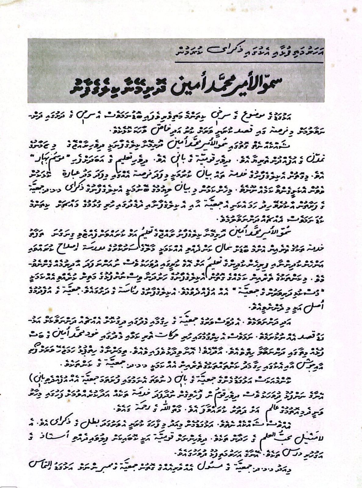 ކޮްނމެއަކަށް އަޅުގަޑުމެންގެ ޖަމްޢިއްޔާގެ ބާނީ (ނެވަތަ އެނަމުގައި ފުރަތަމަ ޖަމްޢިއްޔާއެއް އުފެއްދެވި ބާނީ) އޭނާގެ ނަންފުޅު ދުވަހަކުވެސް ދިވެހި ޤައުމުން ފޮހެވިގެން ނުދާފަދަ ޚިދުމަތް ތަކެއް އަދާކުރެއްވުމަށް ފަހުގައި މިހާރުވަނީ ދެމިއޮތުމުގެ ޢާލަމަށް ދަތުރު ކުރައްވާފައެވެ. މާތްﷲ ގެ ރަޙްމަތުގައެވެ.