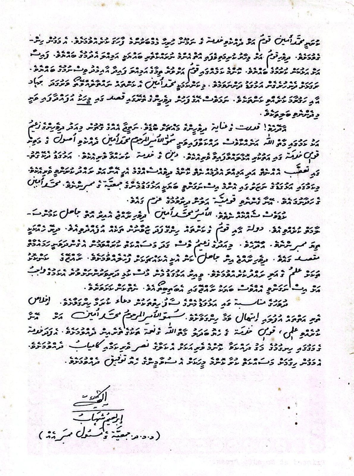 ޚިދުމަތްތައް ބަޔާން ކުރުމަކީ މިފަދަ ފުރުޞަތެއްގައި މިފަދަ މަދު ޢިބާރާތް ކޮޅަކުން ވެވުން އެކަށުގެންވާ ކަމެއް ނޫނެވެ. މިހެން ކަމުން މި ބަޔާން ލިޔުމުގެ ބޭނުމަކީ އެކިލެގެފާނުގެ ޛިކުރާ މ.މ.ދ. ޖަމްޢިއްޔާގެ ފަރާތުން އާކުރެވޭ ހިދު ހަމައެކަނި އެ ޖަމްޢިއްޔާ އާއި އެކިލެގެފާނާއި ދެމެދުގައި ހުރި ގުޅުމުގެ މައްޗަށް ކިތަންމެ ކުޑަ ނަމަވެސް އެއްޗެއް ދަންނަވާލުމެވެ.